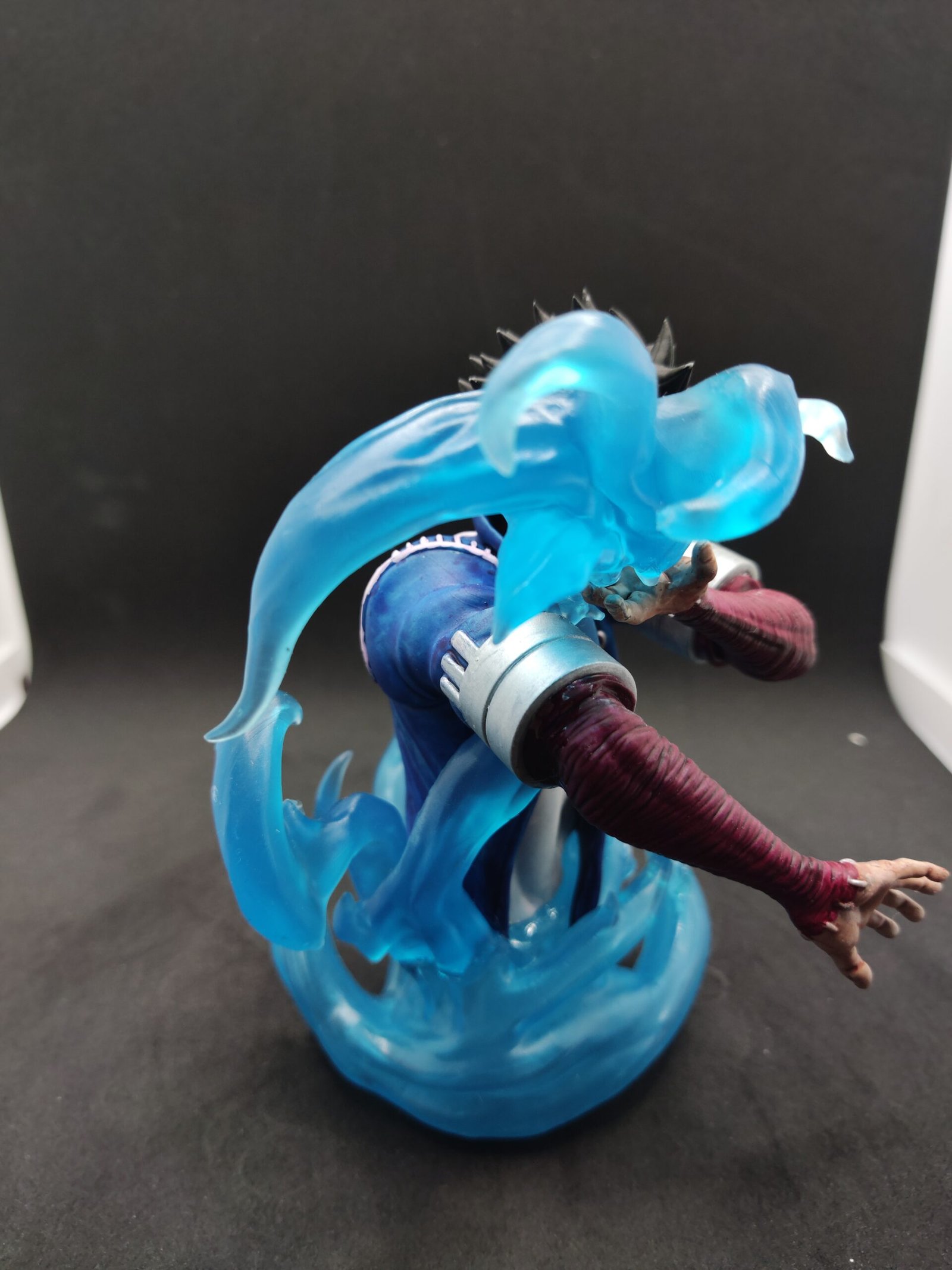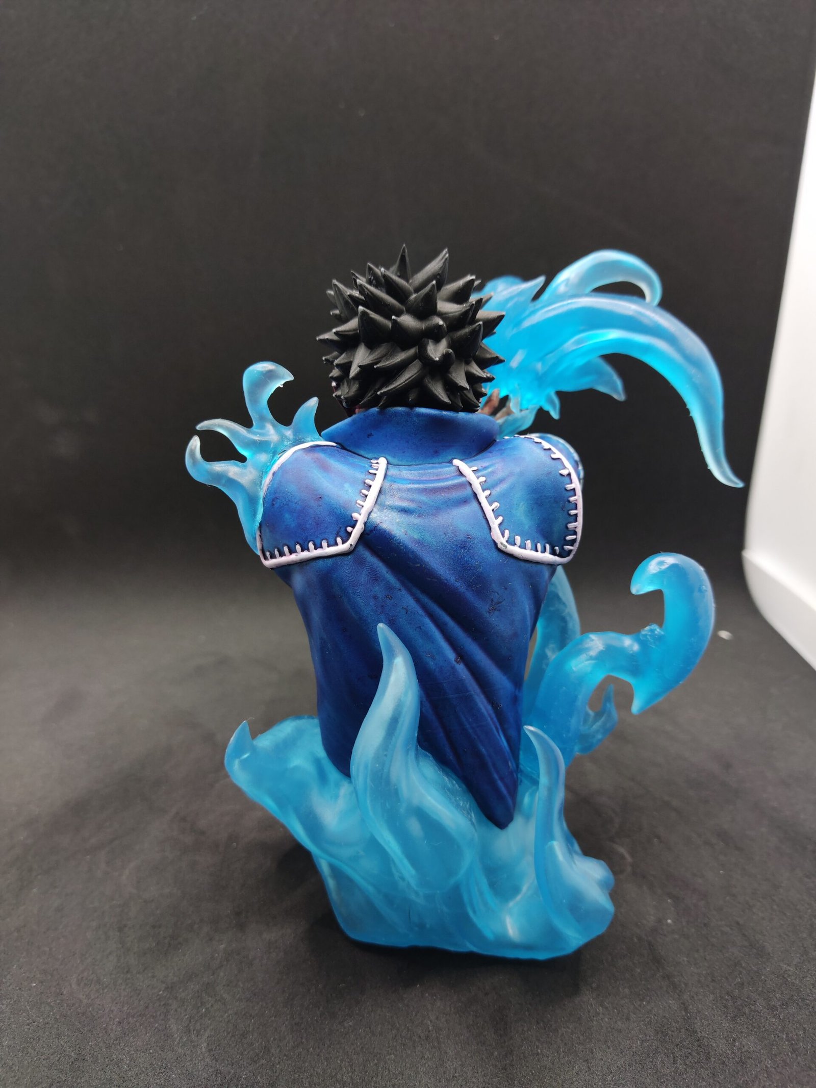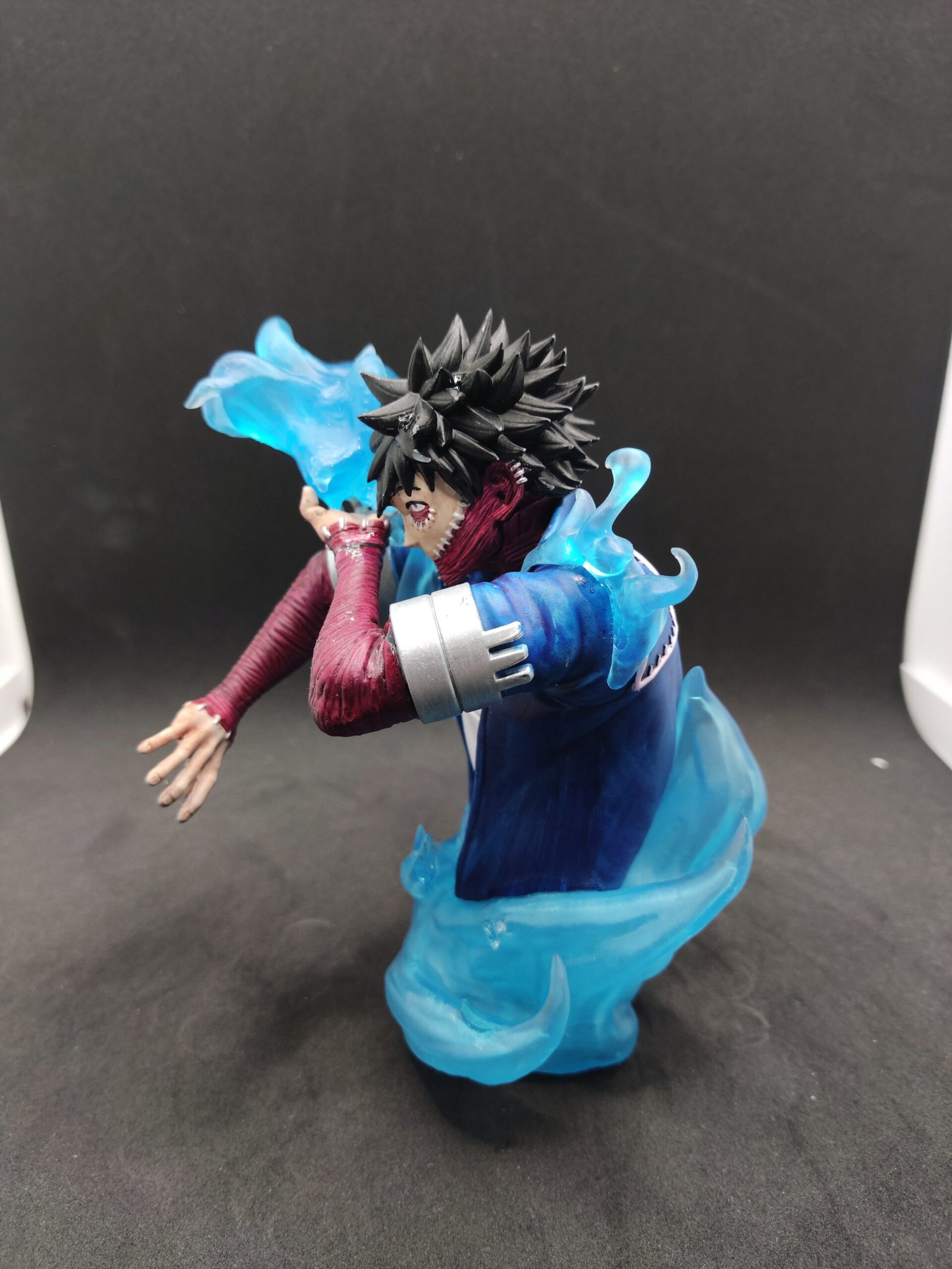 Poder de la Llama: La figura representa a Dabi en plena acción, desatando sus poderosas llamas azules. El efecto de fuego translúcido y brillante que se extiende desde sus manos y lo rodea está minuciosamente esculpido para dar la sensación de movimiento y energía.